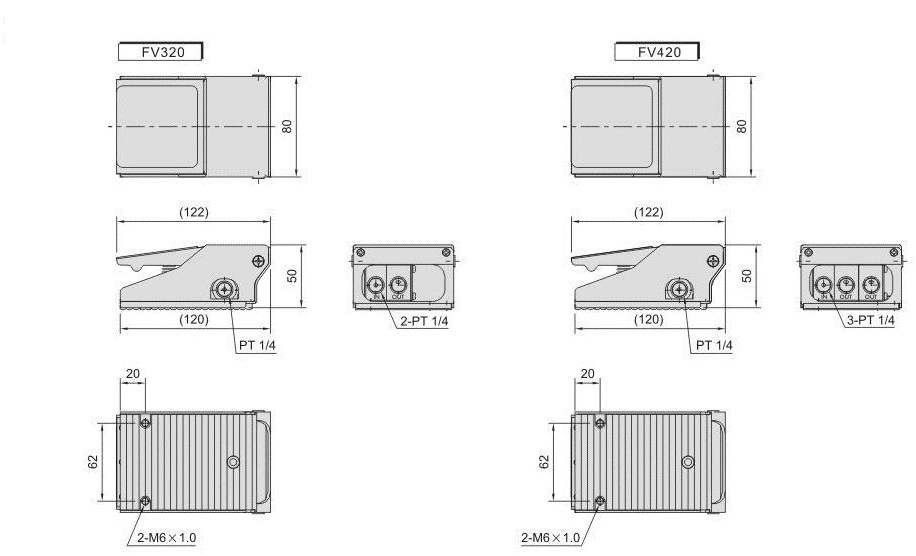 FV320 FV420 foot pedal valve is ideally suited to control spring or loaded return pneumatic cylinders allowing pressurized extension and vented retraction or single-directional pneumatic motors allowing control only in a single direction